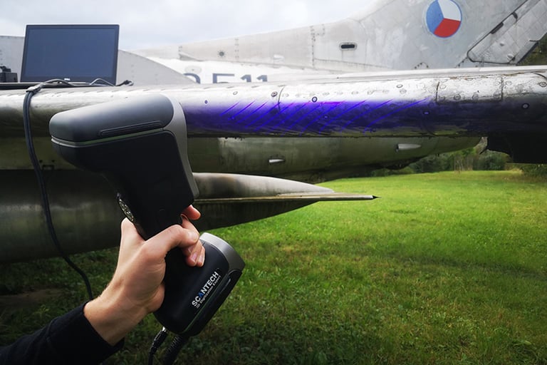 Oppure può essere effettuato un rilievo molto più preciso tramite la nostra strumentazione Scantech, come si può vede affianco durante il rilievo di un veivolo Mig-19.